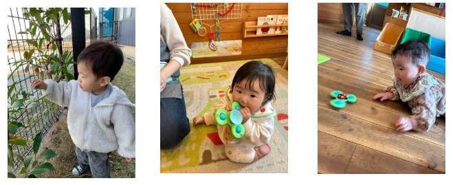 • 乳児(0〜1歳児):月齢に合ったおもちゃでいっしょに遊んだり、抱っこで大きい子たちが遊んでいる様子を見たりして初めての場所でも落ち着いて過ごせるようにしました。時々、お母さんを思い出す時もあり、そんなときはお気に入りの葉っぱを見つけたり、外の風を感じたりする「気分転換」を取り入れ、情緒の安定を図りました。